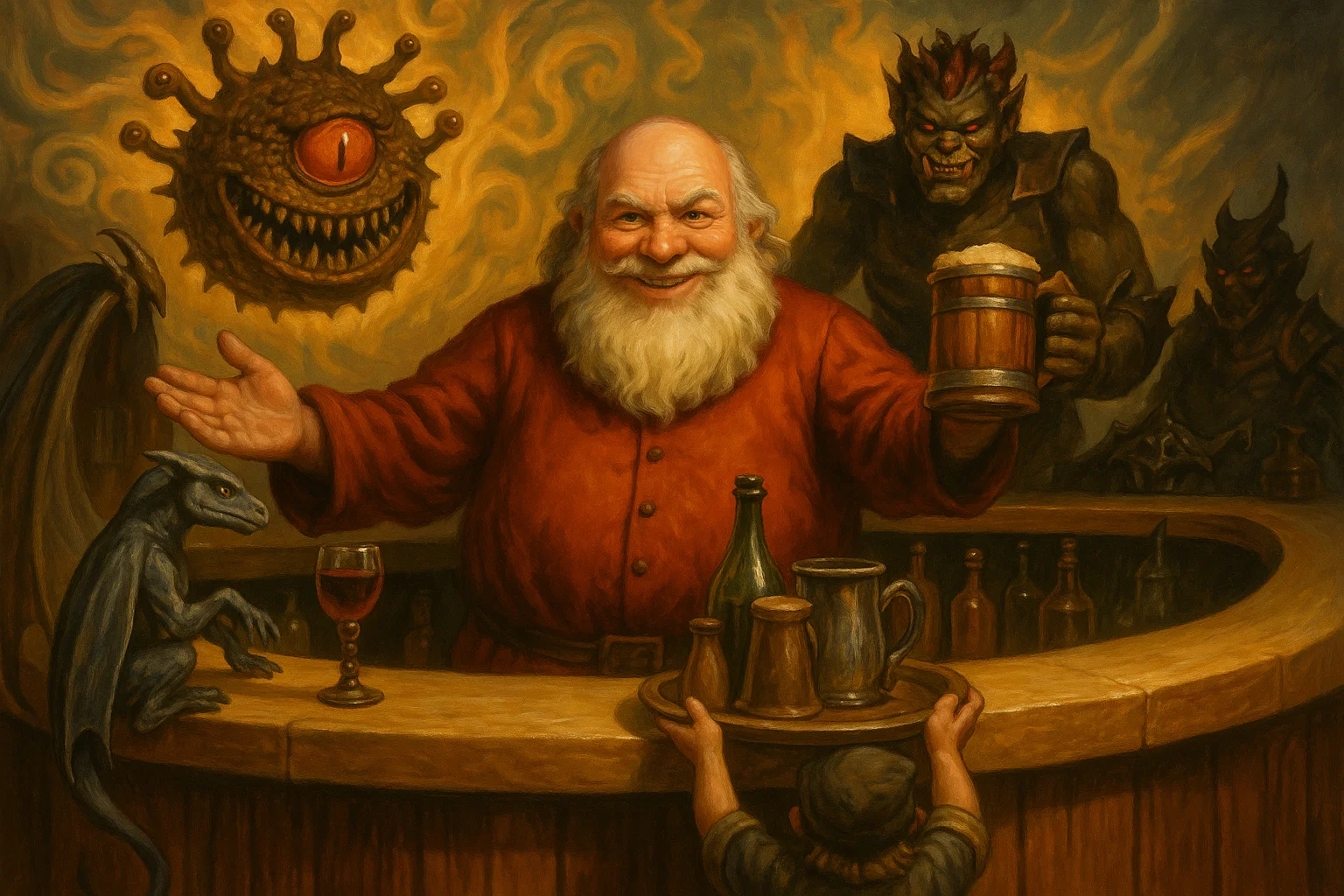 At the heart stands Mitchifer, the master of the Serpent, greeting all as old friends. A stout man with rosy cheeks, a booming laugh, and the power of a minor deity, he maintains order with little more than his presence. He has every drink imaginable, served via an army of nimble gnomes.